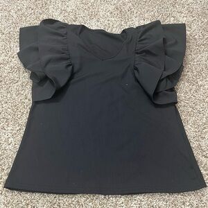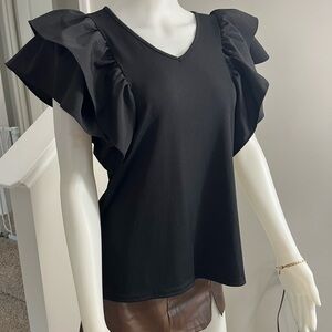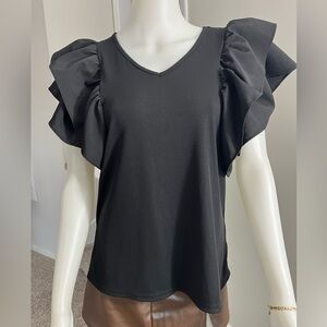 Ribbed V-Neck top with ruffle sleeve detail in black size large