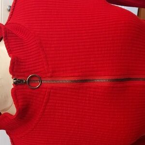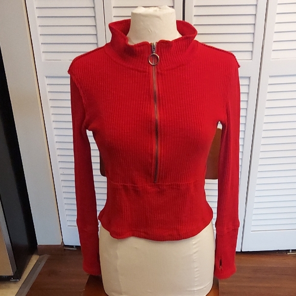 Elevate your style with this vibrant red ribbed top. Featuring a chic zip-up design, it's perfect for any occasion. With finger holes