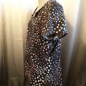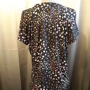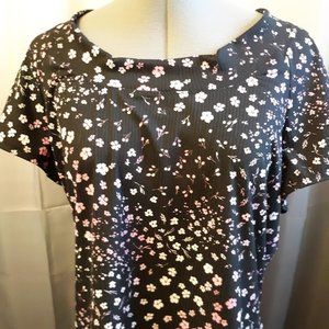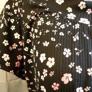 Ribbed pleated Floral Raglan sleeve T-shirt blouse L Pink Black blossom print
