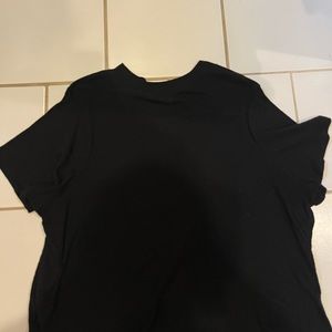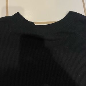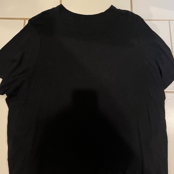 Ribbed tee in solid black with a slight mock neck, short sleeves, no tears or stains in good condition, 50% polyester, 38% cotton, 12% rayon, Nordstrom BP brand