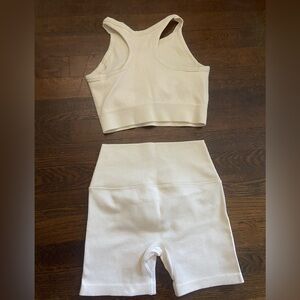 Never worn. Work out set. Removable bra cups in the top. High waisted bottoms. Color is beige 91% nylon 9% spandex