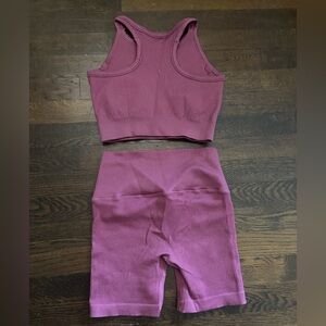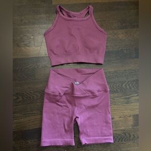 Never worn. Work out set. Removable bra cups in the top. High waisted bottoms. Color is a wine type color /reddish-purple