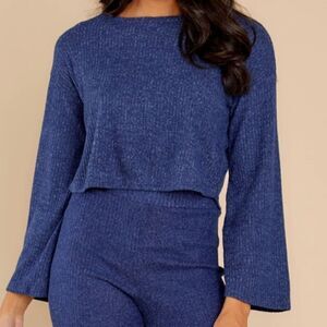 Ribbed Fleece Comfy Casual Cropped Top. Features a relaxed round neckline, long slightly flared sleeves and straight hemline. Matching pants listed separately.