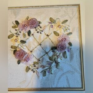 Ribbon Embroidery Art Work 3D Ribbon Flowers with Beautiful Gold Ornate Frame. Art work is new. The frame is brand new. Please see photos for more details and please feel free to contact us with any questions. Measurements