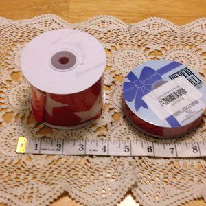 Large, new red and white star ribbon (2 3/4" wide) with some residual label glue on top of cardboard plus new roll of standard size red ric rac roll itself is 3/4" and there is 25 yards on it.
