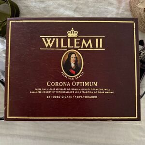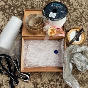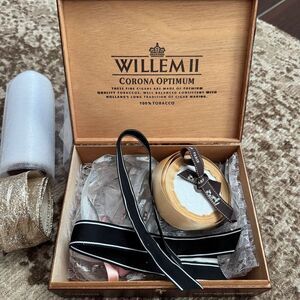 Miscellaneous ribbons (Hermes, golden, lace, black and white, silver…) and an empty Willem II cigar box.