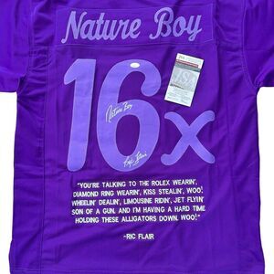 This is a unique opportunity to own a piece of wrestling history. This custom purple stats jersey, signed by the legendary Ric Flair, is a must-have for any wrestling fan. The jersey is an original, authenticated by JSA, and features Flair's signature in bold black ink.