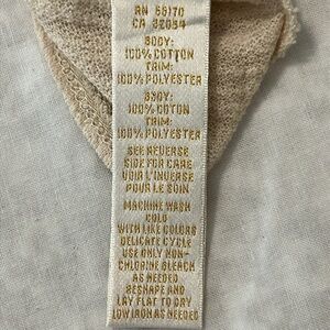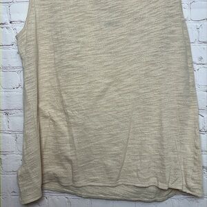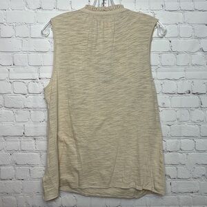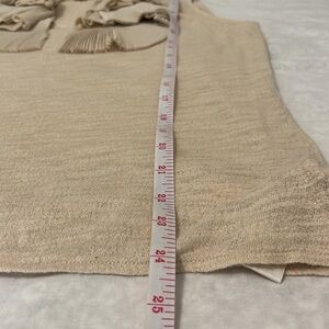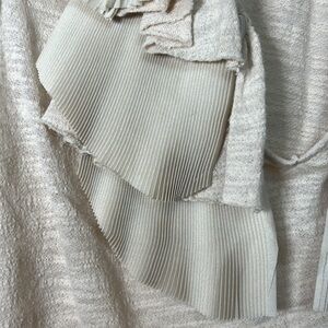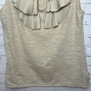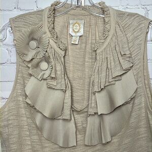 Ric Rac V neck cream sleeveless blouse. Mini ruffle around neckline with larger ruffles on chest. Pleated rosettes at upper right chest.