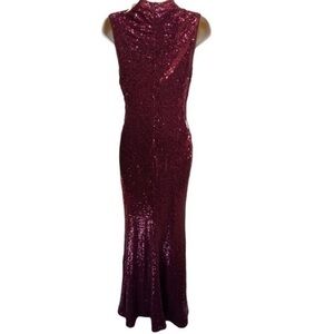 RicaRica Formal Gown in deep red sequins long maxi Mermaid like dress, form fitting. Has a hidden back zipper, it’s sleeveless and a mock neck With cut on the side with tie lace. Beautiful dress. Does run a little on the small side.