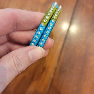 These bangles are wrapped in turquoise blue and green satin fabric and adorned with a row of crystals. Bangles are rigid, ring-shaped bracelets traditionally worn in India. They are significant in Indian culture, often made from various materials like gold, silver, glass, wood, or plastic.