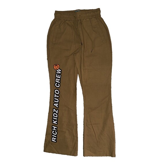 🔥 Ultra-rare Rich Kidz Auto Crew pants are straight fire! Get that authentic throwback, early 2000s moto/streetwear look with a modern wide-leg/bootcut fit. The rich Brown/Camel color is perfectly complemented by bold Orange & White vertical "RICH KIDZ AUTO CREW" side graphics and large star hits on the back ankles. These are an instant outfit centerpiece!