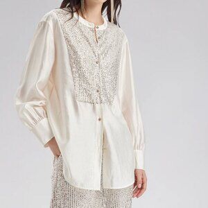 This shirt features high-quality sequin stitching for a unique visual effect, showcasing exquisite details. The collarless design enhances the necklines, adding an elegant touch while effortlessly creating a relaxed, natural style. Perfect for daily outings, dates, or the workplace, it allows the wearer to stand out on various occasions.