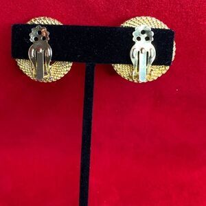 Rich Red Marquis shaped, Faceted and Caged Rhinestones set in a tightly woven swirl with tiny double rope design in Gold plate, clip-on clasp