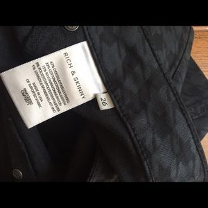 Rich & Skinny black & grey houndstooth skinny jeans. Size 26. Worn but in good condition. Faux front pockets. 42% lyocell 33% cotton 15% rayon 9% polyester 1% spandex. Please comment with any questions. No trades. Thank you!