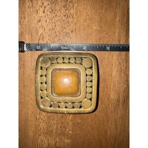 Striking vintage square belt buckle crafted from solid brass with a geometric, brutalist design. Features a raised amber-colored copper center surrounded by a ring of circular brass accents. The buckle has a beautiful aged patina and substantial weight, perfect for collectors or vintage fashion lovers.
