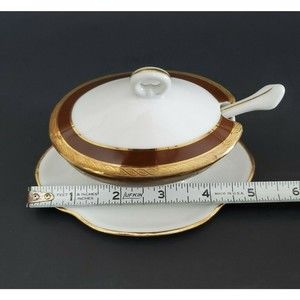 Richard Ginori Palmero Brown China Mustard Pot with Attached Underplate & Original Spoon. Gold 'Rope' Edged Band.