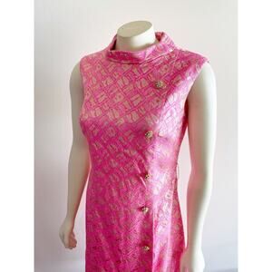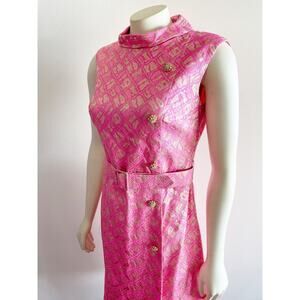 This vintage pink shift dress from Richard Kaplan exudes 1960s glamour. Made with metallic threads, it shimmers and catches the light beautifully. The dress comes with a belt to cinch at the waist and flatter the figure. It is a size 10 and is perfect for any occasion where you want to make a statement. The pink color is feminine and bold, while the metallic threads add a touch of sophistication. This dress is a must-have for any vintage clothing enthusiast or anyone looking for a unique and stylish addition to their wardrobe.