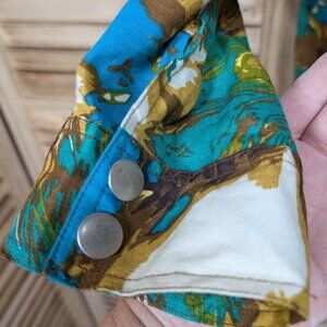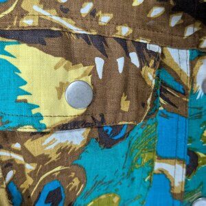 Vibrant jacket with an abstract print in blue, brown, and yellow. Features button closure and pockets.
