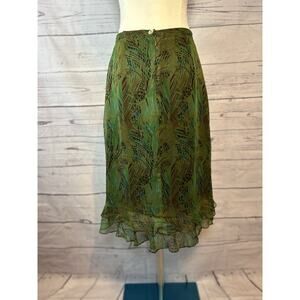 Beautiful olive green silk skirt with abstract dark green leaf prints and a double-layered ruffled hem. Lightweight and flowy. Size medium. Excellent for summer or vacation wear.