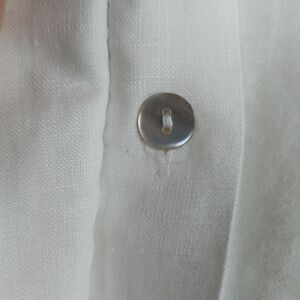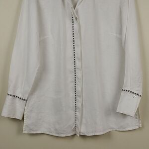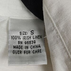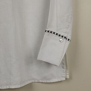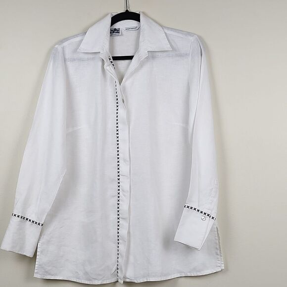 Richard Malcolm White Irish Linen Long Sleeve Button Front Blouse with Black Embroidery. Beautiful Irish Linen blouse with concealed mother of pearl buttons and black cross stitch embroidery down the front and on the oversized cuffs. 100% linen. Size Small.