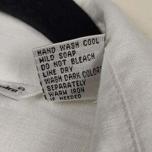 Richard Malcolm White Irish Linen Long Sleeve Button Front Blouse with Black Embroidery. Beautiful Irish Linen blouse with concealed mother of pearl buttons and black cross stitch embroidery down the front and on the oversized cuffs. 100% linen. Size Small.