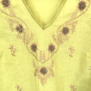 Richard Malcolm Size S 100% Irish Linen Yellow/Green Wooden Beaded Top Blouse3/4 Length sleevesV-neck