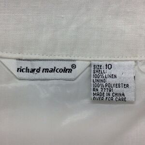 This Richard Malcolm skirt is a perfect addition to any wardrobe. Made of 100% linen, it is lightweight and perfect for summer, spring, or fall. The skirt is an A-line style with a knee-length and features a solid white color with layered accents. The closure is a zip and the skirt is lined for added comfort. The skirt is suitable for a variety of occasions including travel, parties, casual wear, workwear, and business attire. The garment care instructions recommend hand wash only. The skirt is not vintage, but it has a bohemian and beach theme which makes it perfect for any summer day. It is a women's size 10 and made in China.