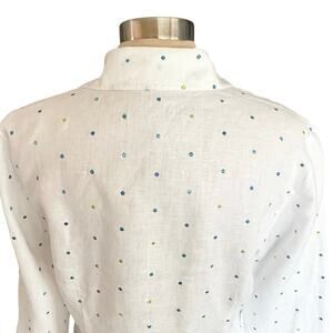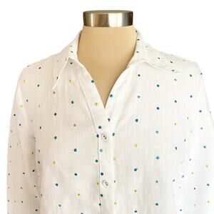 Richard Malcolm White Linen Button Down Top Embroidered Dot LARGE Preppy Coastal. 100% linen. White with tiny embroidered dots in blue and green. In excellent preowned condition,