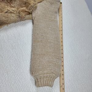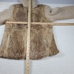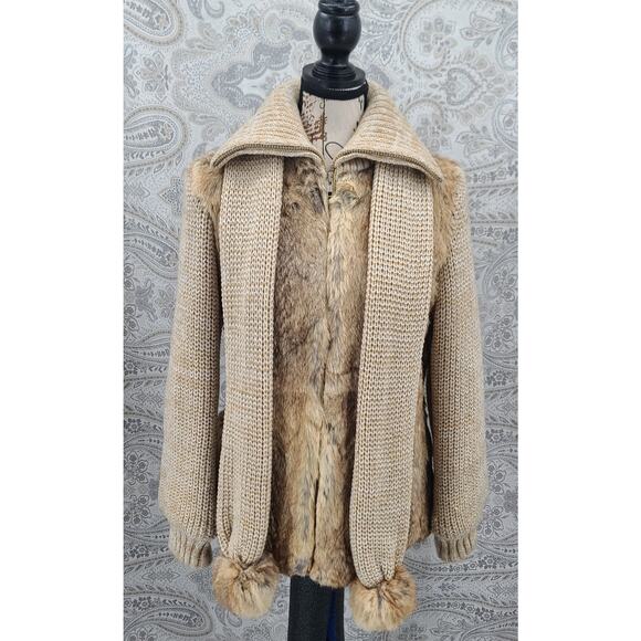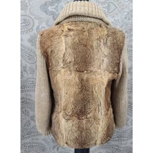 Absolutely stunning vintage coney fur crochet knit jacket featuring plush genuine fur panels paired with a chunky neutral knit. This piece has a luxurious yet relaxed bohemian feel, with rich texture throughout and dramatic fur pom accents at the hem.