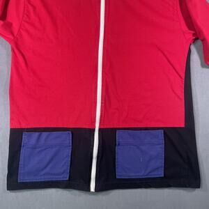 The product is a vintage Richard Simmons women's jacket in size 18W, featuring a black, red, blue, and white colorblock design in a knit polyester fabric. This long jacket has a full zip closure, making it suitable for activewear occasions. It also has shoulder pads, stretch material for comfort, and pockets for added convenience. The regular fit and plus size make it a versatile and stylish addition to any woman's wardrobe.