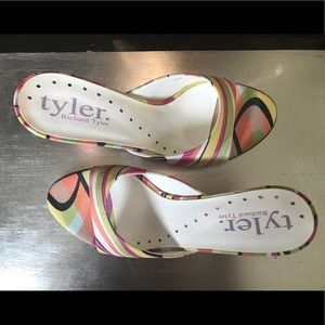 Up your outfit's "wow factor" with these Richard Tyler mules! Pucci wave-pattern in vibrant colors makes these shoes a real statement accessory. Comfortable heel. Never worn.