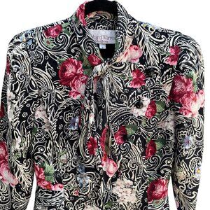 This blouse offers a sophisticated blend of floral elegance and professional styling. Its tie-neck design and vibrant pattern enhance its tailored look.