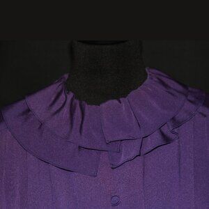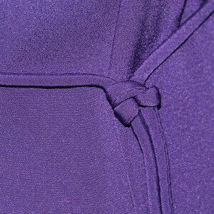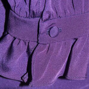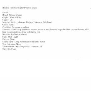 Office, date, party, wedding ready, this deep purple, size 14 midi dress lends that touch of elegance, whatever the occasion. Matching fabric covered buttons with loop fasteners provide an easy front closure. A matching string style belt allows you to cinch the waist as you desire. For more details, see the Description photo. Preowned and well cared for.