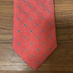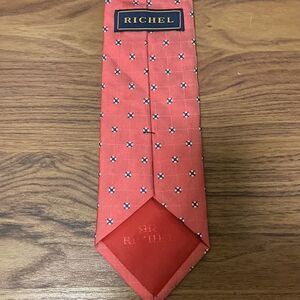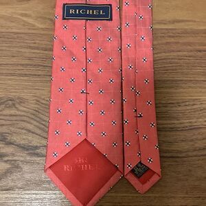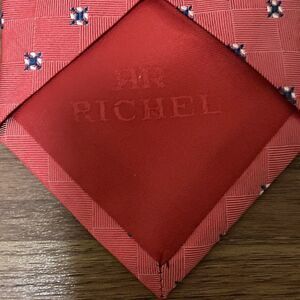 Richel NWOT woven silk tie in red with black & white micro print. Label serves as keeper. Lined in red silk embroidered with Richel logo.