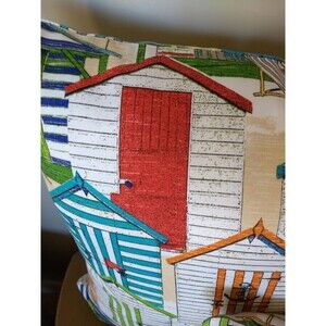 Richloom Solarium Indoor/Outdoor 14"x24" Lumbar Zippered Throw Pillow Cover. Fabric printed in the USA on medium-weight 100% polyester and has repeating multicolored beach hut cabanas with beach chairs and birds. Throw Pillow Cover is stain & water-resistant with a high tolerance for sunlight.