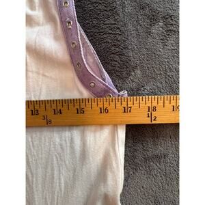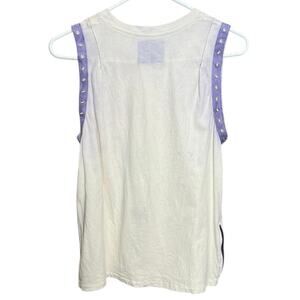 Rick Astley graphic sleeveless top featuring a large front portrait with colorful 80s inspired artwork. Cream base with purple studded side panels and zipper detail at the hem, giving it a custom reworked or fashion forward look. Soft cotton feel with a relaxed drape.
