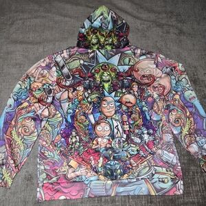 Rick & Morty Pullover Hoodie in Medium Size is a stylish and comfortable garment. This hoodie features a printed design with long sleeves and a hooded neckline. Made of lightweight and breathable polyester knit fabric, this hoodie offers a regular fit and is machine washable for easy care. The multicolor design and Rick and Morty branding add a fun and unique touch to this pullover hoodie.