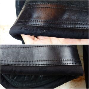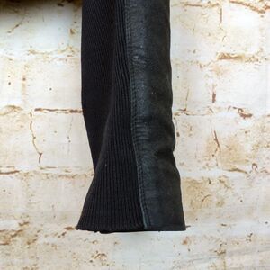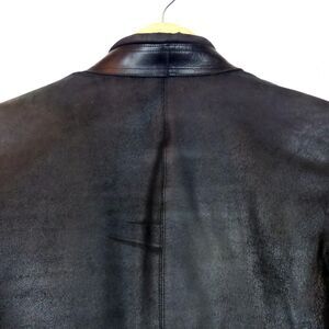 Pre-owned with some flaws, Rick Owen Distressed Lamb Leather Jacket Women 6US Black Open Front Goth Y2K. Cool distressed suede leather with leather and fabric trim around edges. Rib Knit contrast on sleeve for stretch. Lined. Comes with extra button and leather treatment information.