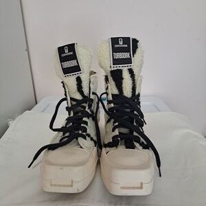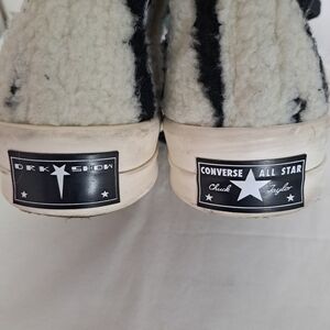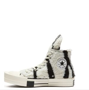 THESE CONVERSE X DRKSHDW TURBODRK HI ARE ZEBRA-INSPIRED FAUX SHEARLING, LACED HIGH TOP SHOES, BASED ON THE CLASSIC CONVERSE 70’S CHUCKS. THEY FEATURE A SIGNATURE DRKSHDW ELONGATED TONGUE WITH A CUSTOM BRANDED WRAP AROUND WOVEN LABEL BEARING THE MODEL NAME. THEY HAVE CONTRAST STITCHING AND LACES, FAUX SUEDE LEATHER LINING AND A SIGNATURE RICK OWENS MOLDED RUBBER HEEL AND MOLDED RUBBER TOE CAP, SUPERIMPOSED ONTO THE CLASSIC 70’S CHUCKS RUBBER SOLE.