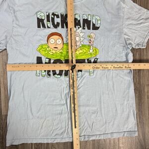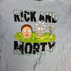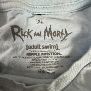 This is a Rick & Morty Adult Swim graphic tee by Ripple Junction, in light blue/gray with a bold “Rick and Morty” print featuring Rick, Morty, and the portal/green slime design. Tag reads 100% cotton, made in Bangladesh, size XL. The shirt shows normal light wear (minor fading) but no rips, holes, or stains visible in photos. Color and print remain vibrant.