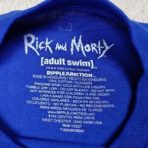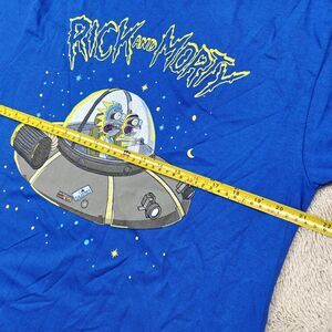 Rick and Morty Adult Swim lime spaceship graphic tee t-shirt, material 100% cotton, color blue, size missing, likely men's size Large.
