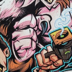Official Rick and Morty black graphic t-shirt featuring a vibrant monster battle scene. Made of 100% cotton, size M/L. A must-have for fans!