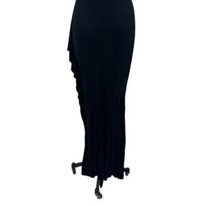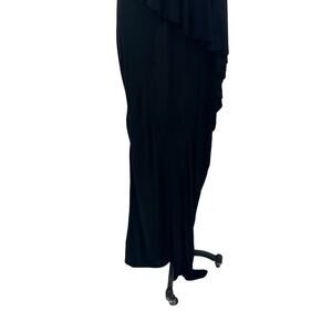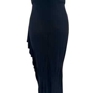 Introducing a stunning black ruffle dress by Rickie Freeman for Teri Jon, perfect for any formal occasion. This dress features an off-shoulder neckline and sleeveless design, with layered ruffle accents that add to its elegant appeal. The dress is made of viscose jersey fabric. The dress is perfect for a wedding, party, or cocktail event, and is sure to make a statement with its long length and zip closure.
