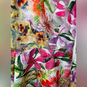 Great pre-owned condition. There is a manufacturer flaw where the fabric was folded when color was added to the fabric. The flowers are white in a small area (shown in photos).