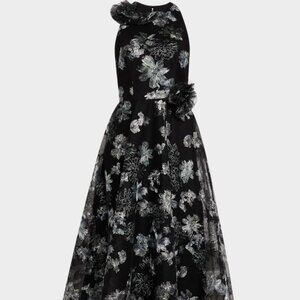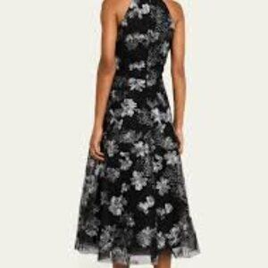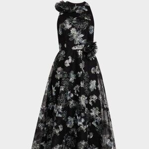 Rickie Freeman for Teri Jon midi dress in tulle with metallic floral embroidery and ruffle floral appliqué