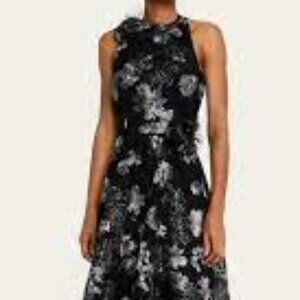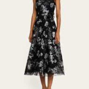 Rickie Freeman Teri John black silver metallic applique tulle midi dress size 4