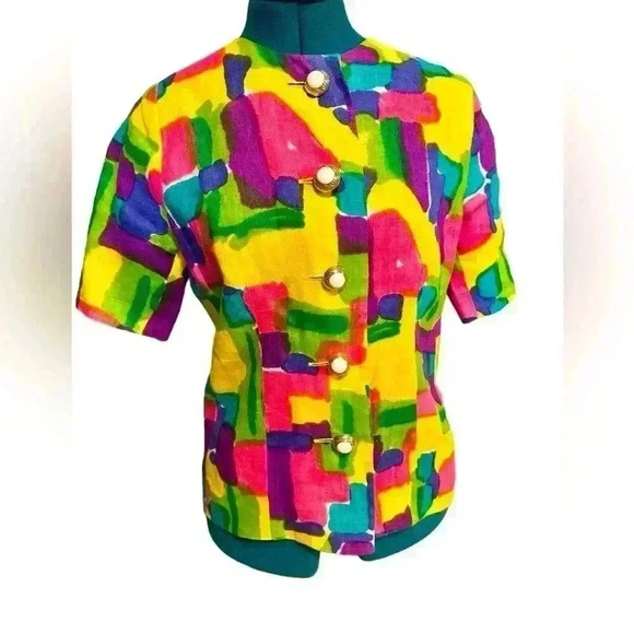 This Rickie Freeman Teri Jon blazer is a one-of-a-kind piece that will make you stand out in any occasion. The bright paint print on linen fabric adds a touch of elegance and sophistication to your wardrobe. The blazer features long sleeves, a button closure, and a short length that makes it perfect for any season.