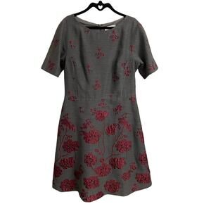 • Features: Zip up back with hook and eye closure, Fit and flare style, Short sleeve, Lined, Gray with raised maroon floral embroidery throughout, Knee length / midi