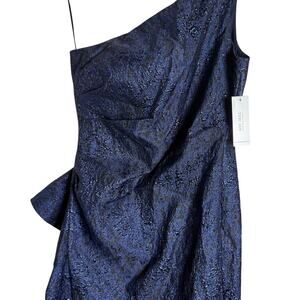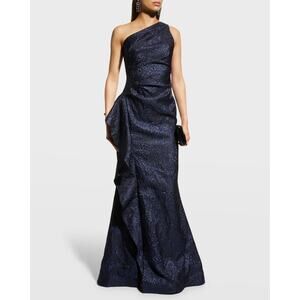 Rickie Freeman Teri Jon Navy One-Shoulder Jacquard Side-Ruffle Evening Gown 16