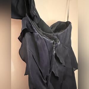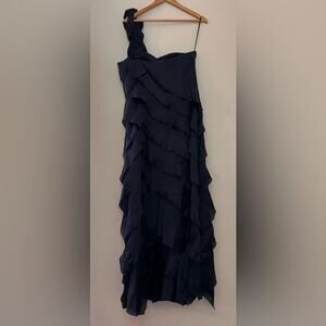 Rickie Freeman Teri Jon Navy Ruffle Tiered Formal Gown w/ Rosette Bow Strap - 12
